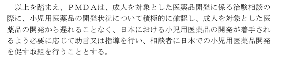 少し前のPMDAからの通知になりますが、小児用医薬品の開発促進に向けて、PMDAが積極的に取り組む姿勢を示す一環として発出されたものになります。