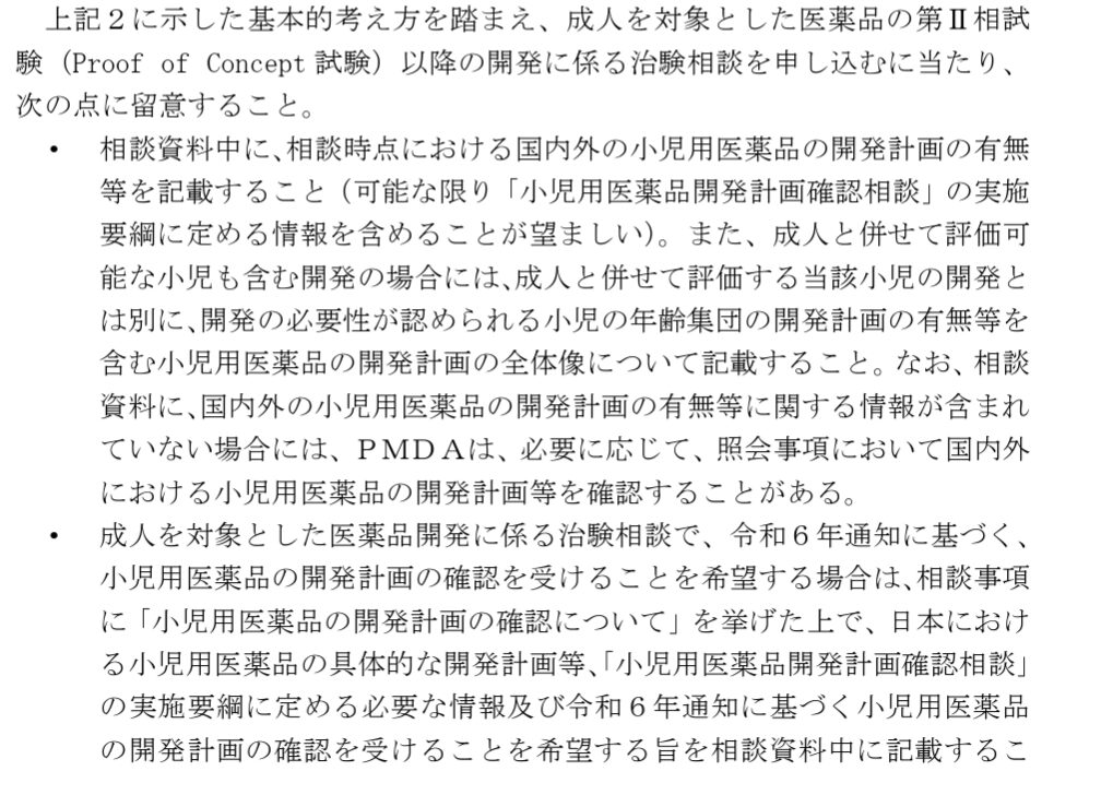 より具体的には、第II相試験以降の治験相談では、申し込みに際して、小児用医薬品の開発に関する情報を示すことが求められます。