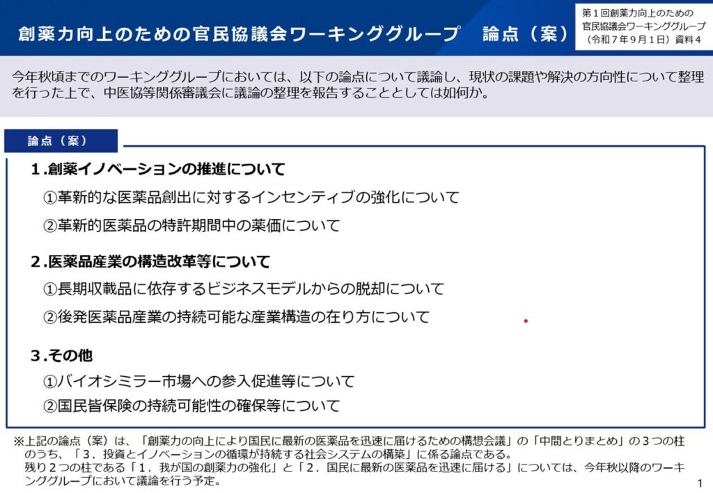 実際、すでに第1回のワーキンググループが2025年9月1日に開催されています。以下はその時の資料からの抜粋ですが、ここでは明示的に薬価制度の論点となっています。