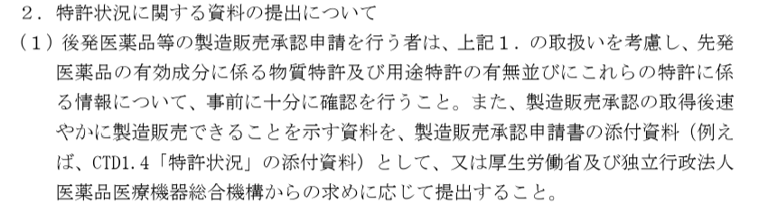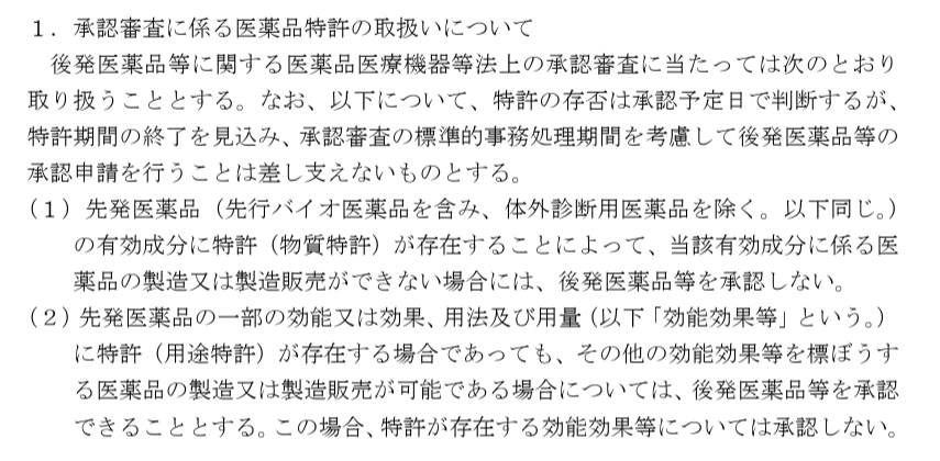 要するに、先発医薬品メーカーが、厚労省(及びPMDA)に特許情報を適切に提供すべき、という運用になっています。特許は、物質特許及び用途特許のいずれも該当します。