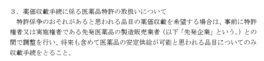 そして、後発医薬品/バイオシミラーの薬価収載においては、特許係争の可能性がある場合は、事前に当事者間で調整しておくべき(厚労省は関与しない)旨が示されています。
