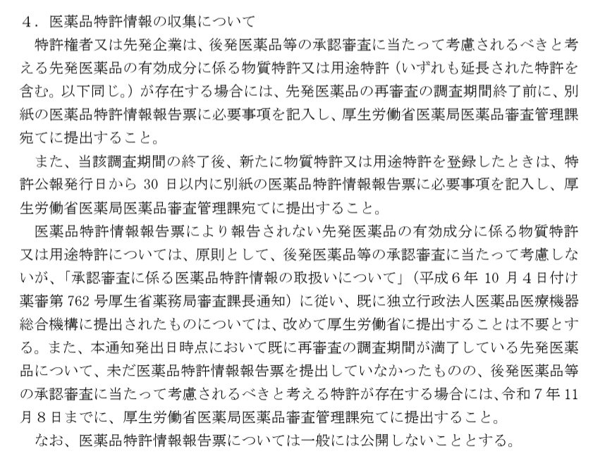 2025年10月8日付けで厚労省から「医療用後発医薬品及びバイオ後続品に関する医薬品医療機器等法上の承認審査及び薬価収載に係る医薬品特許の取扱いについて」という通知が発出されました。
