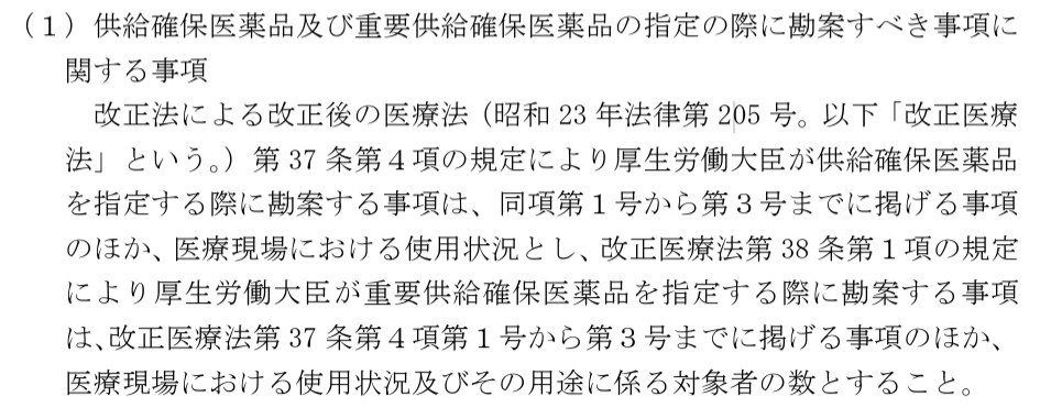 供給確保医薬品は、医療法第37条第4項の以下の条件を勘案して指定されます: