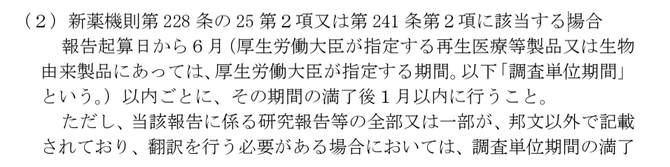 ただし、これらの事象については、個別事例単位での報告は不要であり、6か月ごとにまとめて報告することが可能です。また、6か月間の内容をまとめて、2か月以内(外国語の内容が含まれる場合)に報告することとされています。