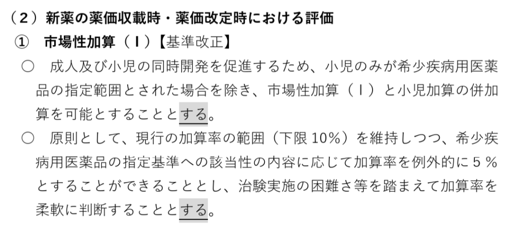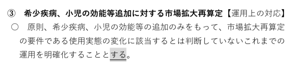また、希少疾病、小児の効能追加等で市場拡大再算定が適用されることがない旨が明示されます。