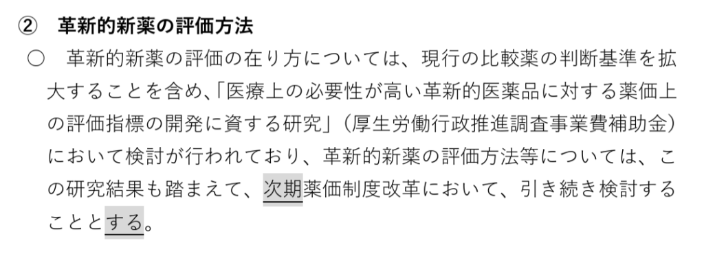 まずは、ドラッグ・ラグ、ドラッグ・ロス対策の流れもあり、革新的新薬の評価をどのように行っていくかは大きな論点のはずですが、厚労省予算による研究(外部有識者による検討)中ということで、何も動きがありませんでした。