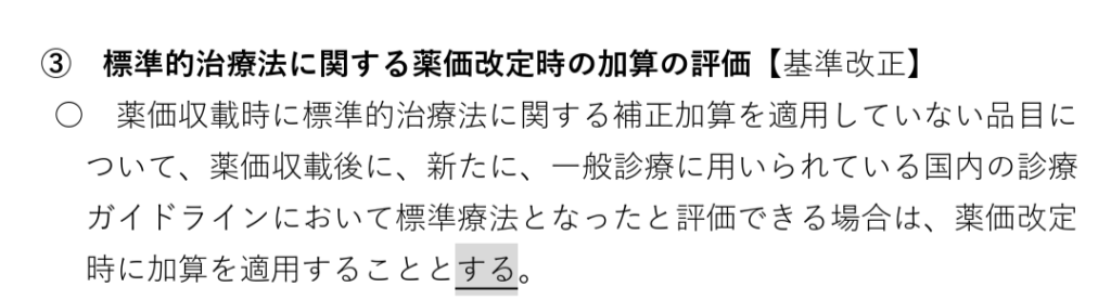 薬価改定時の加算に関連して、以下の標準的治療法に関する加算が手当されました。診療ガイドラインにおいて、標準治療と位置付けられた場合に加算されるものです。補正加算検討時のポイント制度を考えると5%の加算と考えられます。当該補正加算獲得に向けて、企業は、製造販売後のエビデンス集積や学会とのより密な連携といった方向で活動が進むことになりそうです。