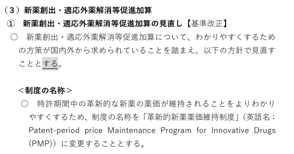 名称変更その1です。新薬創出加算が「革新的新薬薬価維持制度」となります。中身は変わりません。