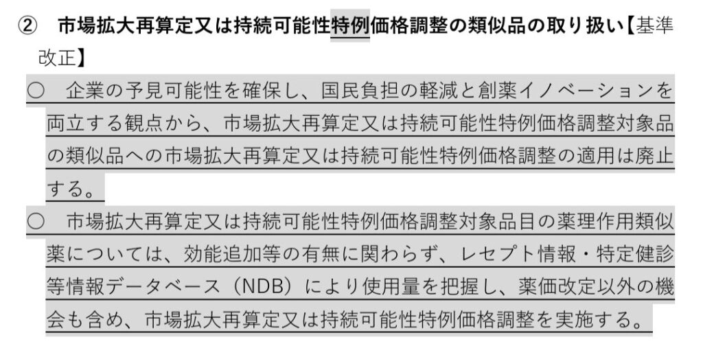 そして、この市場拡大再算定/持続可能性特例価格調整は、政治的な改定となりました。該当品目のみならず類似薬も薬価が下がる、いわゆる「共連れルール」、が廃止されることになりました。
