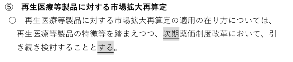 なお、再生医療等製品の市場拡大再算定は、引き続きの検討となっています。