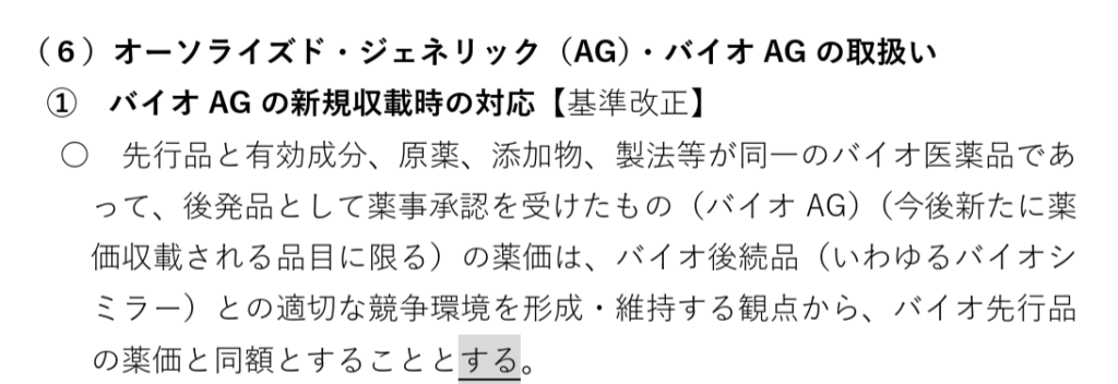 バイオ医薬品のオーソライズド・ジェネリック(AG)については、先発品とAGで同一薬価となることとされました。こちらは、一部の先発品メーカー、後発品メーカーには大きな影響がありそうです。バイオAGを扱う後発品メーカーは、他の後発品メーカーに対して価格競争力を失うことになりますので、厳しい状況になる可能性があります。また、バイオAGを認めていた先発品メーカーは、認めることによって相応の対価を期待していたでしょうから、同じく負の影響を受ける可能性がありそうです。