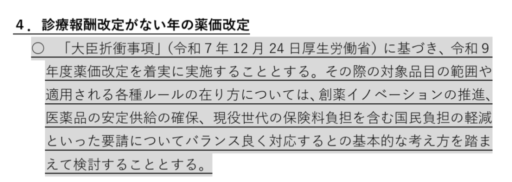 創薬力向上のための官民協議会ワーキンググループにて、2025年11月5日に薬価制度関連の議論整理が示されていました(資料はこちら)。ワーキンググループとしてまとまった提言でもなく各種意見の羅列であり、かつ、その中身も当たり障りのないものとなっていたことから、中医協の場で影響力はなかったと考えます。